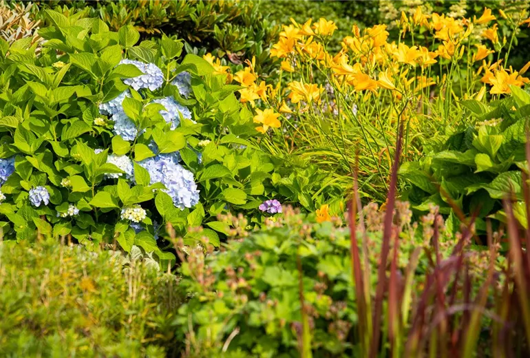 Wenn es um die passenden Begleitpflanzen für Bambus geht, dann sind Laubgehölze ganz vorne mit dabei. Ein besonders beliebter Kandidat: die Hortensie. Ihre großen Blüten sind ein willkommener Kontrast zum Bambus und winterharte Sorten machen sogar bei Schnee und Eis neben dem immergrünen Bambus eine sehr gute Figur. Als Begleitpflanzen für Bambus sind sie eine blühende Ergänzung und sorgen für Abwechslung. Weiteres asiatisches Flair bringt der Fächerahorn ins Spiel. Er passt mit seinem bunten Laub hervorragend zum Bambus und gerade im Herbst zeigt er, was er drauf hat. Gerade in einem fernöstlichen Gartenstil dürfen Bambus und Fächerahorn nebeneinander nicht fehlen. Auch Rhododendren und Azaleen machen sich hervorragend als Begleitpflanzen für Bambus. Sie sorgen mit ihren bunten Blüten schon früh im Jahr für gute Laune und sind mit ihrem Laub auch den Rest des Jahres eine tolle Kulisse für Bambus. Darüber hinaus gibt es noch viele weitere Laubgehölze, die neben dem Süßgras eine richtig gute Figur machen und seine Schönheit unterstreichen. Wichtig sind dabei aber immer die Bodenverhältnisse, denn die sollten sich ähneln, oder die Pflanzen nicht zu dicht zusammen gepflanzt werden.