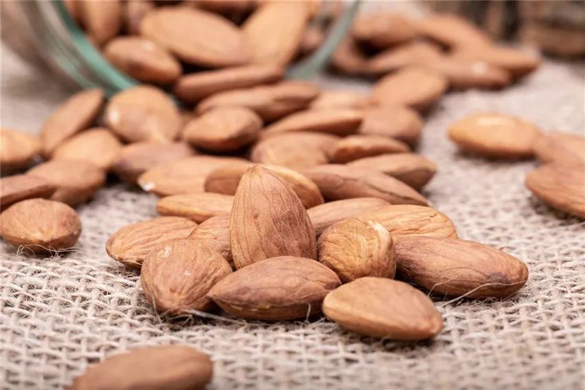 Wenn die Außenschale der Steinfrucht am Mandelbaum aufbricht, wird es langsam Zeit für die Mandelernte. Im August oder September ist es soweit. Die aufgespaltenen Steinfrüchte fallen dann vom Baum und geben ihren heiß begehrten Inhalt, die Mandeln, preis. Sie können jedoch auch direkt vom Baum geerntet werden, bevor sie herunterfallen. Einige Tage sollte man damit aber dennoch warten, denn durch die aufgebrochene Hülle trocknen die Mandeln mit Hilfe der Sonne besser aus, was den Reifeprozess fördert. Sonst machen sich auch Eichhörnchen und Vögel über die seltene Leckerei her. Eine Plane, die rund um den Mandelbaum ausgebreitet wird, erleichtert das Auflesen des Ernteguts. Für Mandeln, die weiter oben am Baum hängen, kann eine Teleskopstange bei der Ernte empfehlenswert sein.