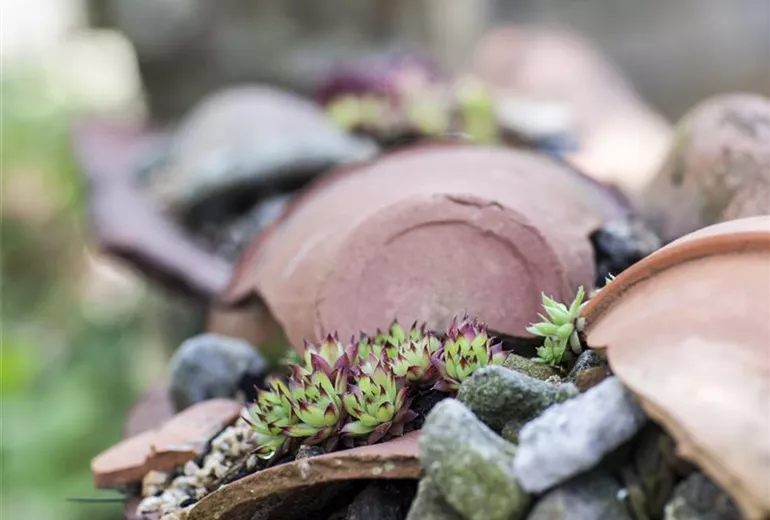 Ganz gleich ob das Gefälle künstlich aufgeschüttet wurde oder ob es bereits natürlich vorhanden ist, entscheidend für das Gelingen eines Steingartens ist die Drainage. Denn die meisten Steingartenpflanzen vertragen keine Staunässe. Um einen guten Wasserablauf zu gewährleisten, kann eine dicke Schicht aus Kies, Schotter beziehungsweise auch Mauerbruch aufgeschüttet werden. Auf diese Drainageschicht kommen dann die dekorierenden Steine. Dafür können nahezu alle Steinarten genutzt werden: Lavagranulat, Granit, Schiefer, Jurakalkstein oder andere. Die jeweilige Steinart will wohl überlegt werden. Denn bei dieser sollte es später – bei einer eventuellen Erweiterung – auch bleiben. Vom wilden Mischen verschiedener Gesteinsarten ist abzuraten. Auch was die Form und Größe der einzelnen Steine betrifft, ist es besser eine gewisse Einheitlichkeit zu wahren. Schließlich soll der Steingarten später insgesamt ein harmonisches, natürliches Bild ausstrahlen.