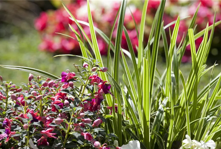 Oft hört man davon, dass Fuchsien keine Sonne vertragen und daher einen halbschattigen oder schattigen Standort brauchen. Das trifft auch teilweise auf Fuchsien im Kübel zu, aber es kommt auf die Umstände an. Dabei kommt es auf die Nachbarpflanzen und die Luftfeuchtigkeit an. Pflanzen brauchen in der Sonne generell mehr Wasser, als im Schatten. Und auch Fuchsien haben einen erhöhten Wasserbedarf, wenn sie in der Sonne stehen. Generell sollte man Fuchsien, die im Kübel gepflanzt wurden, vor Sonne schützen. Der Wurzelballen darf sich nicht aufheizen und so sollten Pflanzgefäße, die schnell warm werden, vor der Sonne geschützt werden. Fuchsien, die ausgepflanzt wurden, sind dagegen wesentlich toleranter, was die Sonne betrifft. Fuchsien, die im Beet einen sonnigen Platz bekommen, blühen sogar reicher, als an einem schattigen Platz. Allerdings muss der Wurzelbereich im Schatten liegen. Das funktioniert am besten, wenn die Fuchsie mit schlichten Pflanzen unterpflanzt wird. Dafür eignen sich zum Beispiel Efeu, Dickmännchen oder Immergrün.