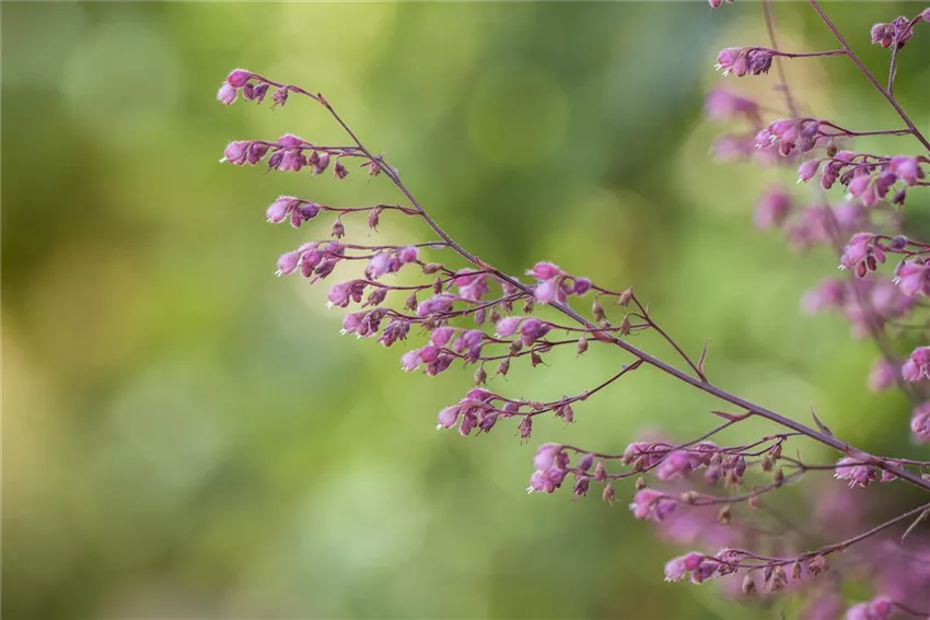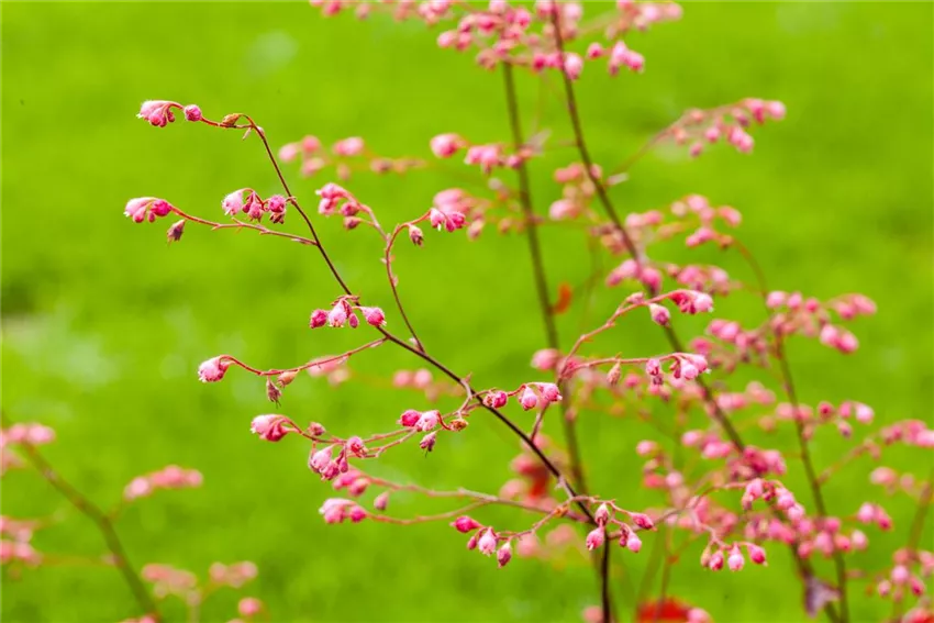 Purpurglöckchen punkten mit ihren filigranen Blüten. Die kleinen, trichterförmigen Glockenblüten wachsen an der Pflanze in langstieligen Blütenrispen und schweben fast über dem Rest der Pflanze. Purpurglöckchen tauchen den Garten mit ihren Blüten von April bis September in ein Blütenmeer aus weiß, rosa oder rot. Bei den neuen Züchtungen sind aber nicht mehr nur die filigranen Blüten ein Hingucker: die neuen Sorten stechen mit ihrem bunten Laub aus dem Staudenbeet hervor. Das Laub kann in den unterschiedlichsten Farben leuchten: von Grün über Orange und Dunkelrot bis Silber, Violett und Bronze ist nahezu alles dabei.