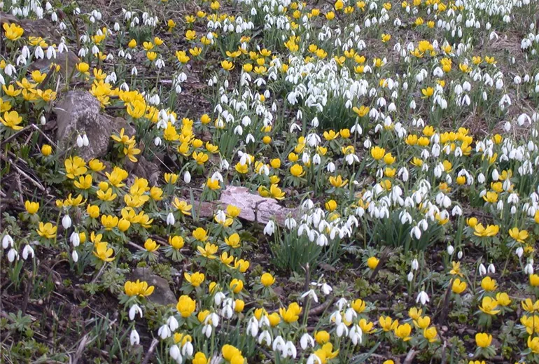 Die Knollen der Winterlinge werden 3 bis 5 Zentimeter tief in den Boden gesetzt. Halten Sie einen Abstand von 8 bis 10 Zentimetern ein: Blütenteppiche bilden die Pflanzen im Laufe der Zeit ganz von selbst. Um dem Winterling die Kältephase angenehm zu machen, können Sie die Pflanzstelle mit Kompost abdecken. Zwischen Februar und März recken die Winterlinge dann ihre Köpfe und freuen sich über eine regelmäßige Versorgung mit Humus, zum Beispiel durch Laub oder weiteren Kompost. Es reicht, diesen um die Pflanze herum zu verteilen. Einarbeiten in den Boden birgt die Gefahr, die flach vergrabene Knolle freizulegen. Winterlinge kann man hervorragend mit anderen Frühblühern kombinieren. Dafür können Sie auch eine Rasenfläche nutzen. Diese sollten Sie dann allerdings nicht vor Ende Mai mähen, weil das Laub des Winterlings erst dann einzieht. Sollten Sie sich dafür entscheiden, blühende Exemplare zu kaufen, können Sie diese im Frühling direkt in den frostfreien Boden pflanzen.