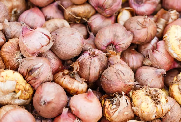 Wenn Sie die Pflanze ausgegraben haben, werden die Stängel auf etwa 1 bis 2 Zentimeter über der Knolle gestutzt. Gartenerde sollte vorsichtig und gründlich entfernt werden. Sitzt die Erde sehr fest, können Sie die Knollen ein paar Tage an einem warmen Ort trocknen lassen. Dann lassen sie sich leichter reinigen. Außerdem wird die Zwiebelhaut entfernt sowie kleine Nebengewächse, die so genannten Brutzwiebeln. Wenn Sie die Knolle vorbereitet haben, lassen Sie sie zur Sicherheit eine weitere Woche vollständig trocknen, bevor sie ins Winterquartier einzieht. Auch sollten die Knollen auf Fäulnis und weiche Stellen geprüft werden. Bewahren Sie nur gesunde Knollen auf. Die meisten Knollenschäden lassen sich äußerlich gut erkennen. Verfärbungen und verhärtete oder weiche Stellen sind Hinweise auf Krankheiten wie Lackschorf, Septoria-Knollenhartfäule oder Fusarium-Trockenfäule. Auch Thripse sind eine bekannte Plage. Die frühzeitige Entnahme der Knollen aus dem Boden reduziert die Gefahr eines Befalls.