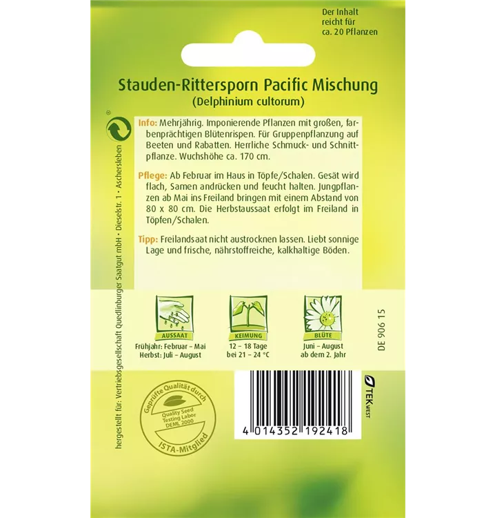 Der Pacific-Garten-Rittersporn (Delphinium pacific) ist eine aufrechte Staude, die, je nach Sorte, Blüten in verschiedenen Farben bildet. An einem sonnigen, windgeschützten Standort mit durchlässigem, humosem Boden erreicht er gewöhnlich eine Höhe von ca. 2 m und wird ca. 80 cm breit. Der Pacific-Garten-Rittersporn ist gut frostverträglich.