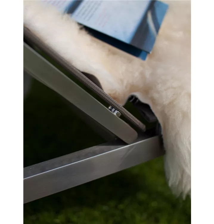Die Sonnenliege RIVIERA punktet mit geradlinigem Design und hochwertiger Verarbeitung. Das Gestell ist aus gebürstetem, rostfreiem Edelstahl gefertigt und passt besonders gut in modern gestaltete Außenbereiche. Hohen Liegekomfort und variable Nutzung bietet die mehrfach verstellbare Rückenlehne. Dank der Nylon-Räder, die eine hohe Verschleißfestigkeit prägt, ist die Sonnenliege zudem leicht rollbar. Die Liegefläche ist mit einem Original Batyline® Gewebe in Silber bezogen, dessen Nähte zusätzlich verschweißt sind und somit eine lange Haltbarkeit garantieren. Der Stoff ist darüber hinaus besonders reißfest, UV-resistent, formstabil und leicht zu reinigen. Im Unterschied zu anderen Outdoor-Stoffen ist die Batyline®-Faser komplett durchgefärbt und daher besonders farbecht. Damit ist die RIVIERA Sonnenliege ein qualitativ hochwertiges Outdoor-Möbel, an dem Sie lange Freude haben werden!