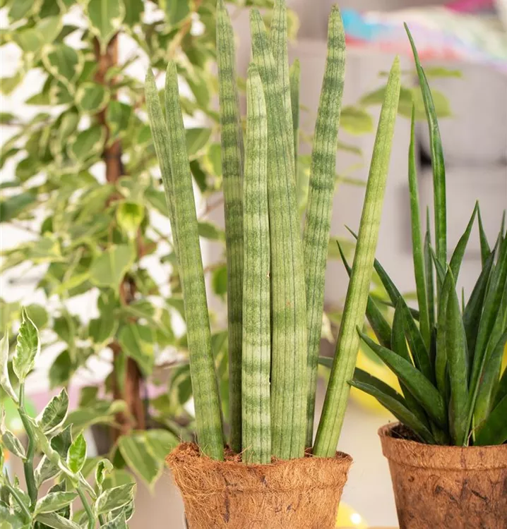 Der Bogenhanf 'Spaghetti' (Sansevieria cylindrica) ist eine weiß blühende Pflanze, die dickfleischige, gestreifte Blätter trägt. Diese aufrechte Pflanze gedeiht am besten an einem hellen Standort.