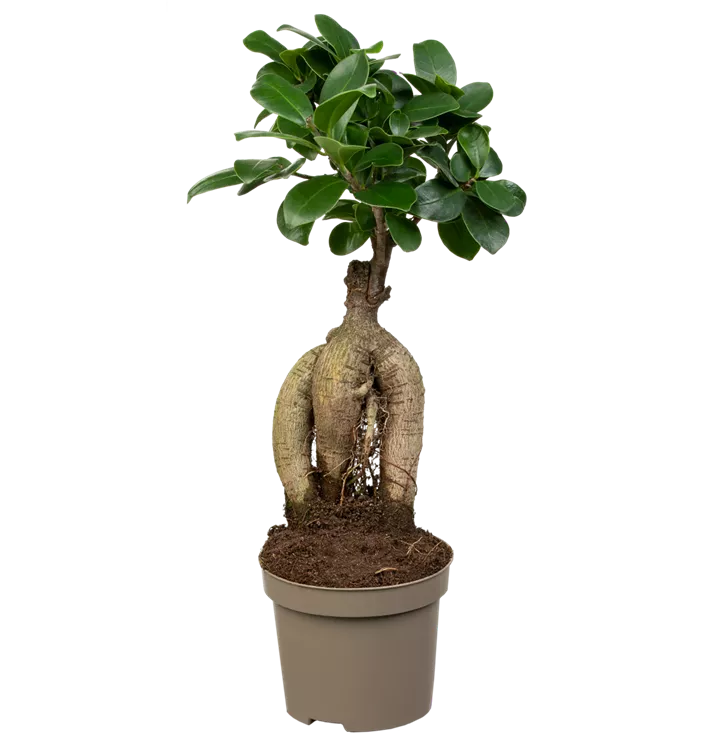 Die Chinesische Feige 'Ginseng' (Ficus microcarpa) trägt dunkelgrüne, eiförmige Blätter. Diese bizarre und verzweigte Pflanze gedeiht am besten an einem halbschattigen Standort.