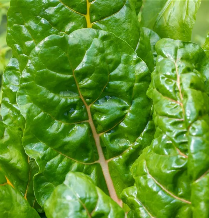 Zum Verzehr geeignet. Die dunkelgrünen, gewellten Blätter und die gelben bis roten Blattstiele überzeugen mit pikantem Geschmack.