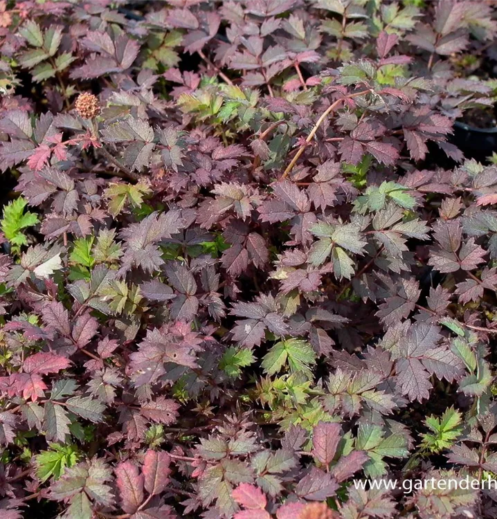 Hoher Blattschmuckwert. Die wintergrünen Blätter des Stachelnüsschens sind blau-grün, gefiedert, gezähnt.