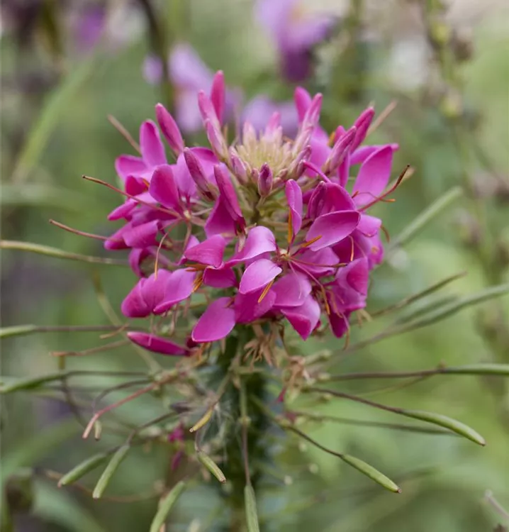 Cleome spinosa 'Sparkler Rose' bildet während der gesamten Saison zahlreiche rosafarbene Blüten. Diese verströmen einen angenehmen Duft.