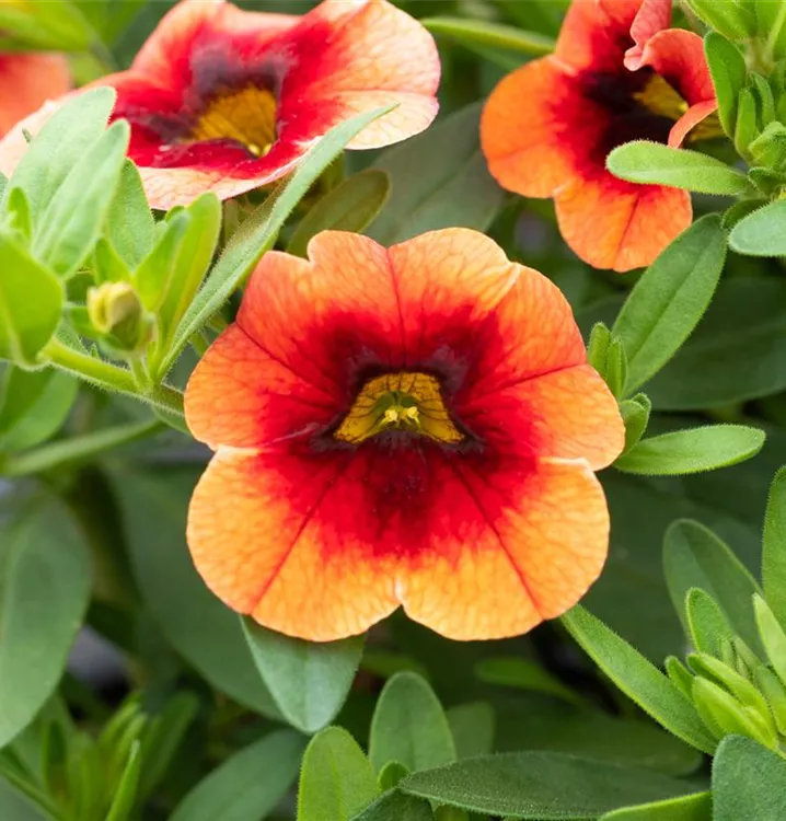Calibrachoa 'Calita® Orange Red Eye' bildet während der gesamten Saison zahlreiche trichterförmige, orange-rote Blüten.