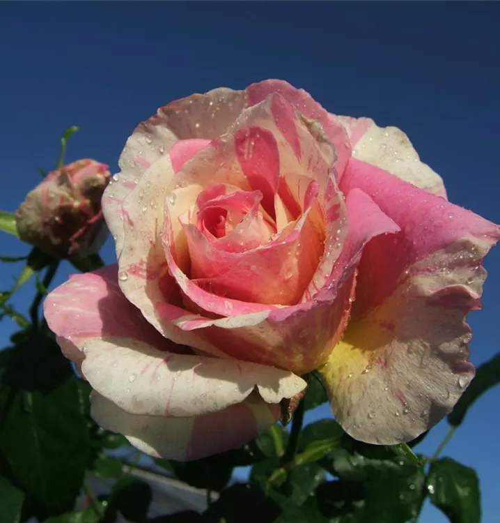 Die Edelrose 'Claude Monet'® (Rosa) ist eine reichblühende Rose, die im Garten eine besondere Rolle spielt. Die zahlreichen Blüten sind mehrfarbig und erscheinen von Juni bis Oktober. Ihr wunderbarer Duft entfaltet sich besonders an sonnigen, warmen Tagen. Mit den richtigen Begleitern an ihrer Seite, kommt die Königin der Blumen besonders gut zur Geltung. Niedrige Stauden, Lavendel und Salbei eignen sich ganz gut für diese Zwecke.