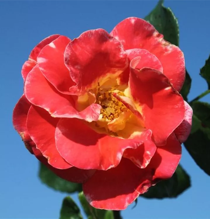 Die orange-gelben, halbgefüllten, schalenförmigen Blüten der Beetrose 'Airbrush'® erscheinen in Dolden von Juni bis September. Diese werden etwa 7 - 8 cm groß.