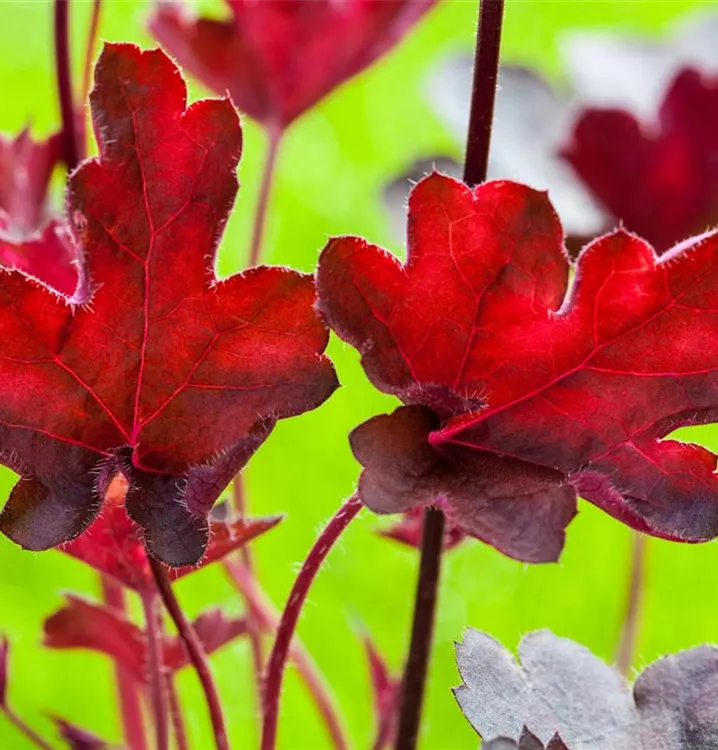 Das Rotlaubige Purpurglöckchen (Heuchera) ist eine buschige wintergrüne Staude mit dekorativen, roten Blättern. An einem sonnigen bis halbschattigen Standort mit durchlässigem, nährstoffreichem Boden erreicht es gewöhnlich eine Höhe von ca. 50 cm und wird ca. 40 cm breit. Das Rotlaubige Purpurglöckchen ist gut frostverträglich.