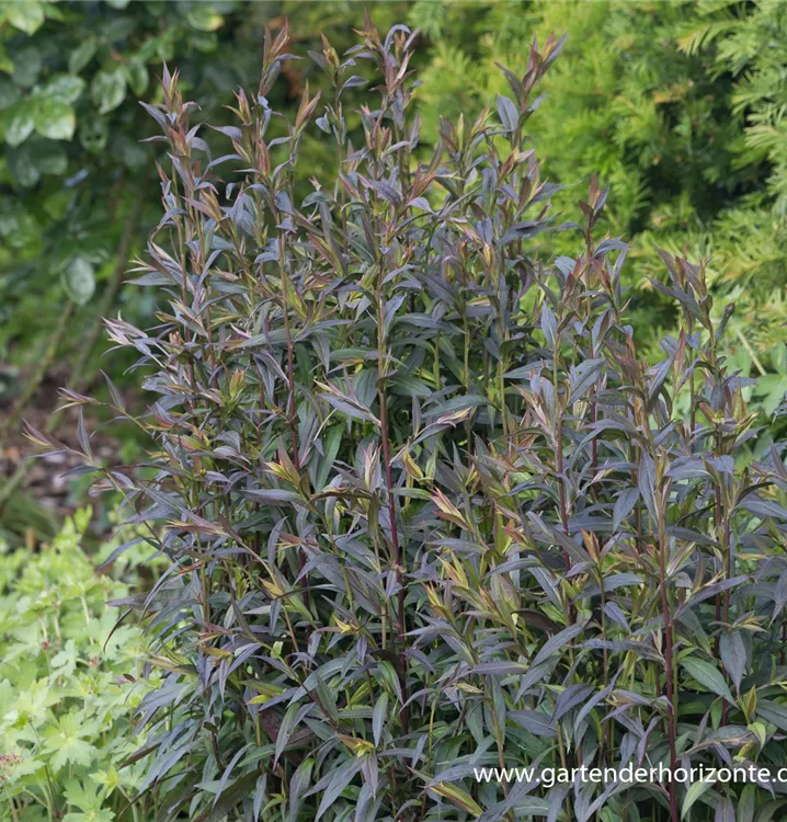 Die sommergrünen Blätter der Waagerechte Garten-Aster 'Lady in Black' sind dunkelgrün, lanzettlich. Purpurroter Austrieb.