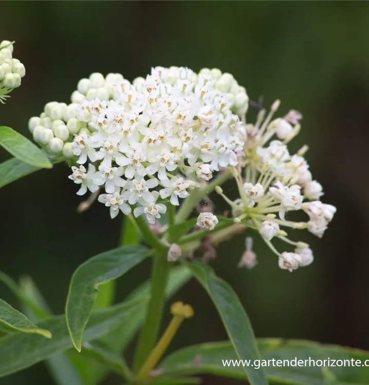 Asclepias incarnata 'Ice Ballet' bildet sternförmige, in Dolden angeordnete, weiße Blüten ab Juli. Diese verströmen einen angenehmen Duft.