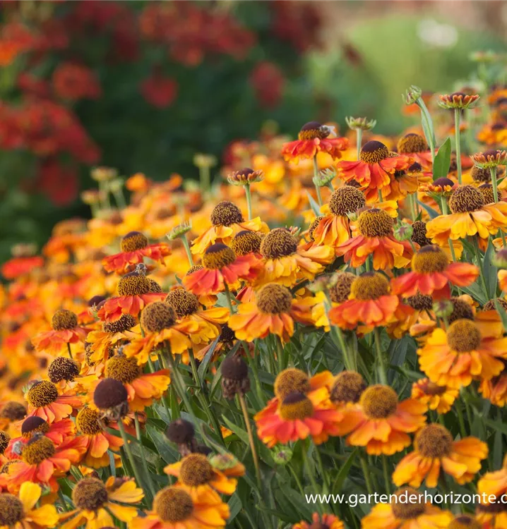 Helenium 'Mardi Gras' bildet körbchenartige, orange-rote Blüten ab Juli.
