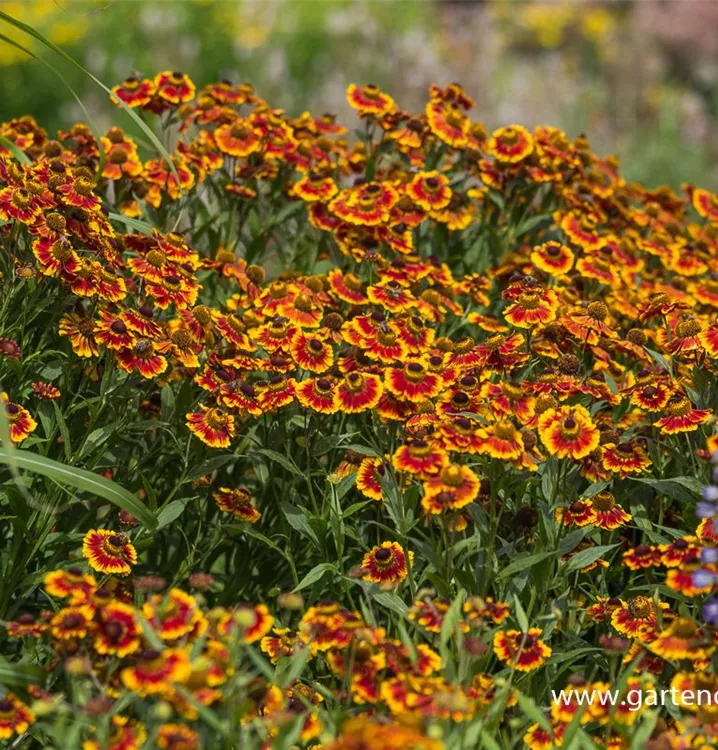 Helenium 'Biedermeier' bildet körbchenartige, rot-gelbe Blüten ab Juli.