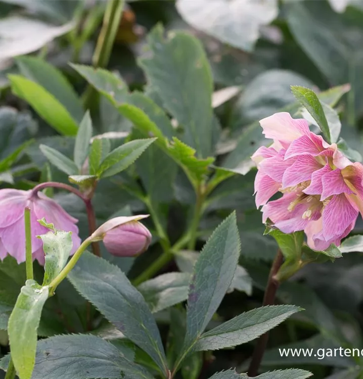 Die Garten-Lenzrose 'Double Ellen Pink' ist wintergrün.