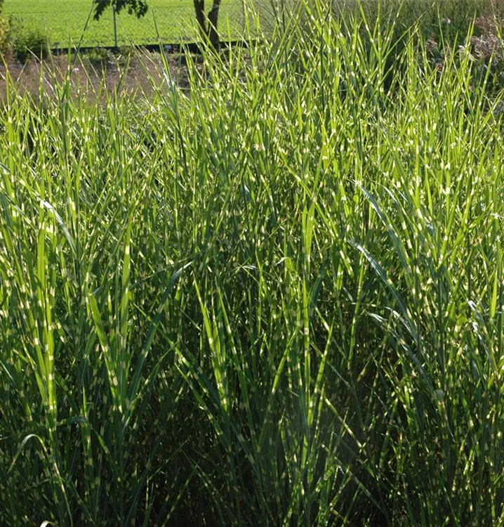 Das Garten-Zebraschilf (Miscanthus sinensis) ist mit seiner gelb-grünen Blattfärbung ein dekoratives Gestaltungselement im Garten, welches sich an einem sonnigen Standort mit einem möglichst durchlässigen, humosen, nährstoffreichen Boden am wohlsten fühlt. Die rot-braunen Blütenwedel schmücken die aufrecht wachsende Pflanze ab Herbst. Bei günstigen Bedingungen erreicht dieses winterharte Gras eine Höhe von ca. 1,5 m und wird bis zu 80 cm breit.