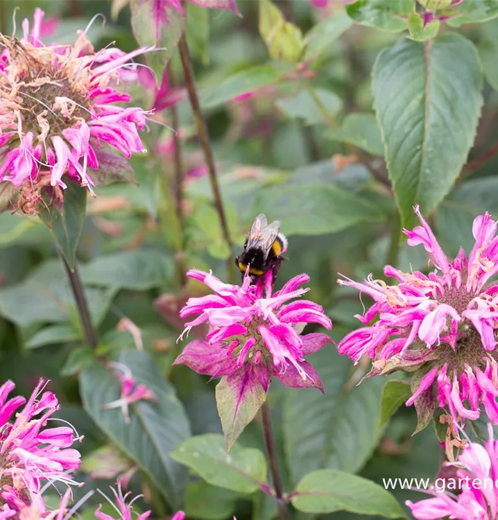 Die Garten-Indianernessel 'Marshall´s Delight' (Monarda fistulosa) ist eine aufrechte, verzweigte Staude, die von Juli bis September rosafarbene, lippenförmige, in Quirlen angeordnete Blüten bildet. An einem sonnigen Standort mit durchlässigem, nährstoffreichem Boden erreicht sie gewöhnlich eine Höhe von ca. 1 m und wird ca. 60 cm breit. Die Garten-Indianernessel 'Marshall´s Delight' ist gut frostverträglich.