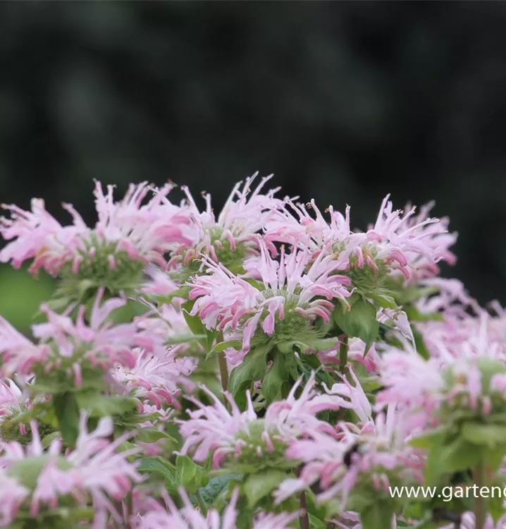 Monarda fistulosa 'Fishes' bildet lippenförmige, in Quirlen angeordnete, rosafarbene Blüten ab Juli.