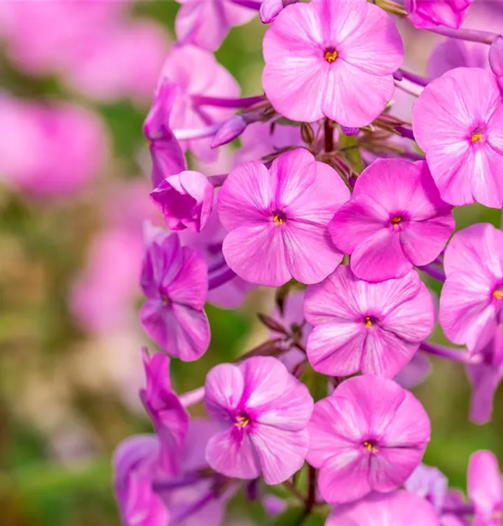 Phlox carolina 'Rosalinde' bildet radförmige, in Dolden angeordnete, pinke Blüten ab Juni. Diese verströmen einen angenehmen Duft.