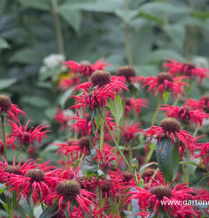 Die Scharlach-Indianernessel 'Jacob Cline' (Monarda didyma) ist eine aufrechte Staude, die von Juni bis August scharlachrote Blüten bildet. An einem sonnigen Standort mit durchlässigem, humosem, nährstoffreichem Boden erreicht sie gewöhnlich eine Höhe von ca. 1,2 m und wird ca. 60 cm breit. Die Scharlach-Indianernessel 'Jacob Cline' ist gut frostverträglich.