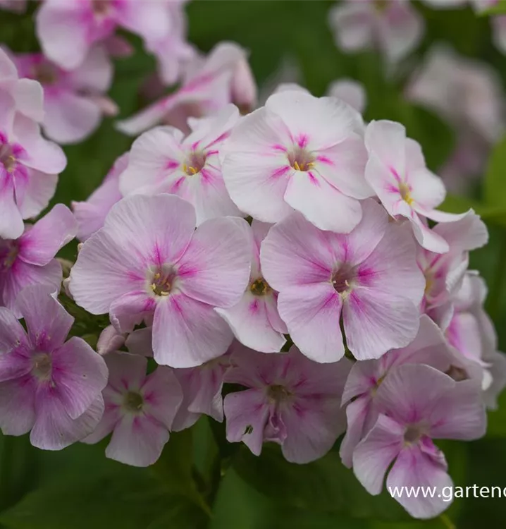 Phlox paniculata 'Younique Bicolor' bildet in Dolden angeordnete, weiß-rosafarbene Blüten ab Juli. Diese verströmen einen leichten Duft.