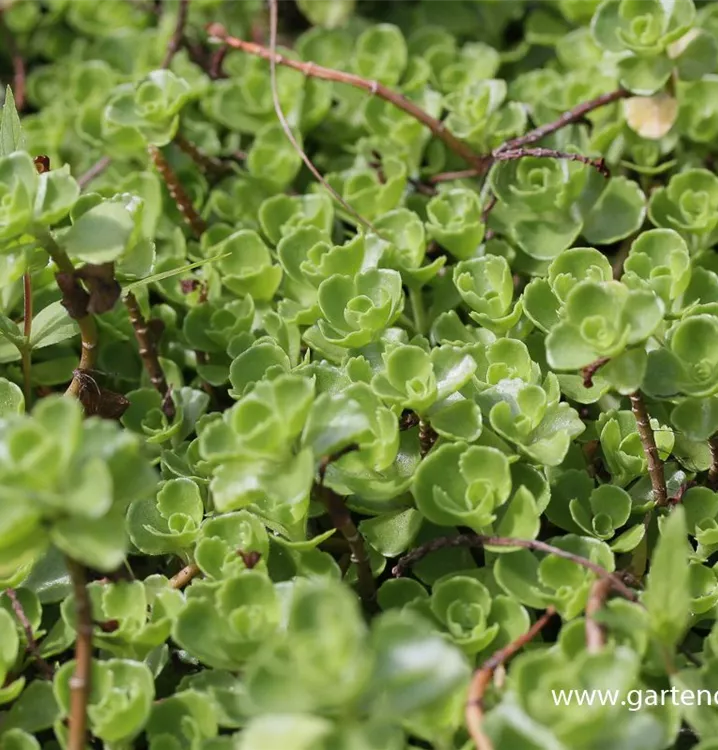 Das Garten-Teppich-Fettblatt 'Album Superbum' (Sedum spurium) ist eine teppichartige, buschige, kissenförmige, kriechende wintergrüne Staude, die von Juli bis August weiße, in Dolden angeordnete Blüten bildet. An einem sonnigen, windgeschützten Standort mit durchlässigem, nährstoffreichem Boden erreicht es gewöhnlich eine Höhe von ca. 15 cm und wird ca. 25 cm breit. Das Garten-Teppich-Fettblatt 'Album Superbum' ist gut frostverträglich.
