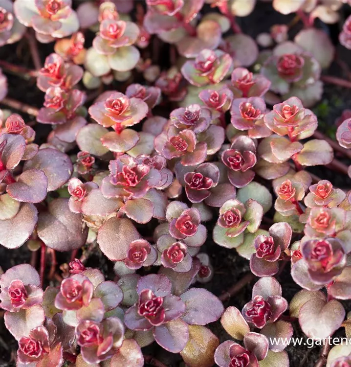 Das Garten-Teppich-Fettblatt (Sedum spurium) ist eine teppichartige wintergrüne Staude, die von Juni bis Juli rosafarbene, in Dolden angeordnete Blüten bildet. An einem sonnigen, windgeschützten Standort mit durchlässigem, nährstoffreichem Boden erreicht es gewöhnlich eine Höhe von ca. 10 cm und wird ca. 20 cm breit. Das Garten-Teppich-Fettblatt ist gut frostverträglich.