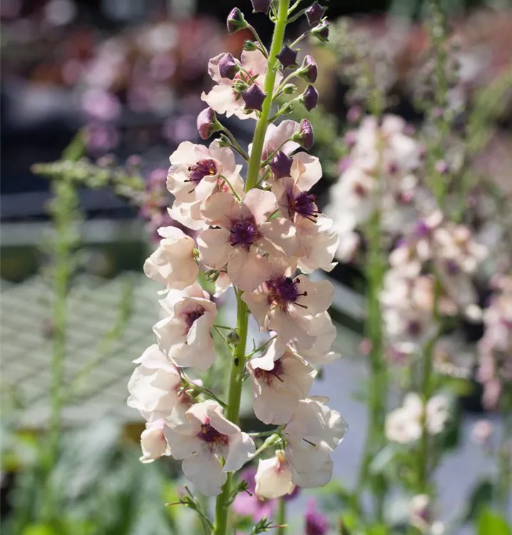 Die Purpurblütige Königskerze (Verbascum phoeniceum) ist eine aufrechte, rosettenartige wintergrüne Staude, die von Mai bis Juni purpurrote, schalenförmige, in Rispen angeordnete Blüten bildet. An einem sonnigen Standort mit durchlässigem, nährstoffreichem Boden erreicht sie gewöhnlich eine Höhe von ca. 1 m und wird ca. 40 cm breit. Die Purpurblütige Königskerze ist gut frostverträglich.