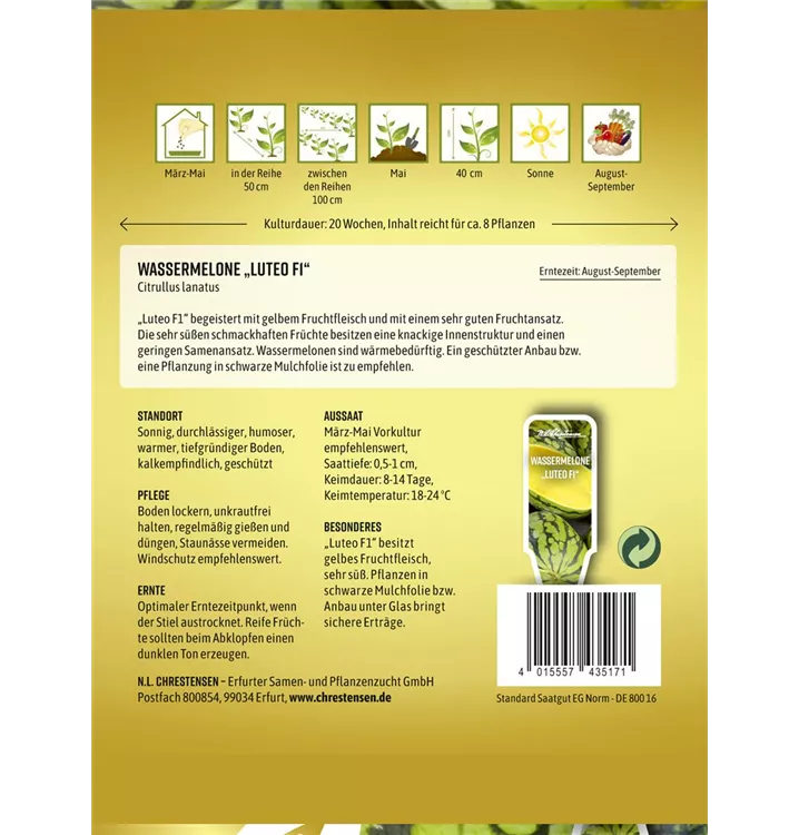 Die Gelbfleischige Wassermelone 'Luteo' (Citrullus lanatus var. lanatus) bildet Früchte, die erfrischend, süß schmecken und bereits ab Juli geerntet werden können. Für das optimale Wachstum der Gelbfleischige Wassermelone 'Luteo' werden ein sonniger Standort und durchlässiger, nährstoffreicher Boden benötigt.