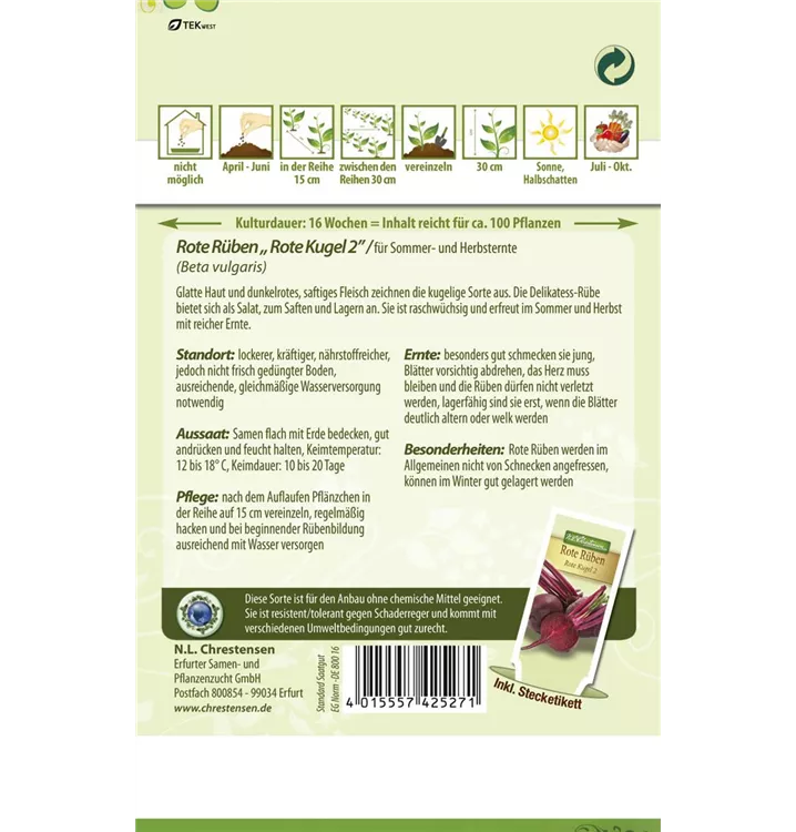 Die Rote Beete 'Rote Kugel 2' (Beta vulgaris) bildet Knollen, die pikant schmecken und bereits von August bis November geerntet werden können. Für das optimale Wachstum der Rote Beete 'Rote Kugel 2' werden ein sonniger Standort und durchlässiger, nährstoffreicher Boden benötigt.