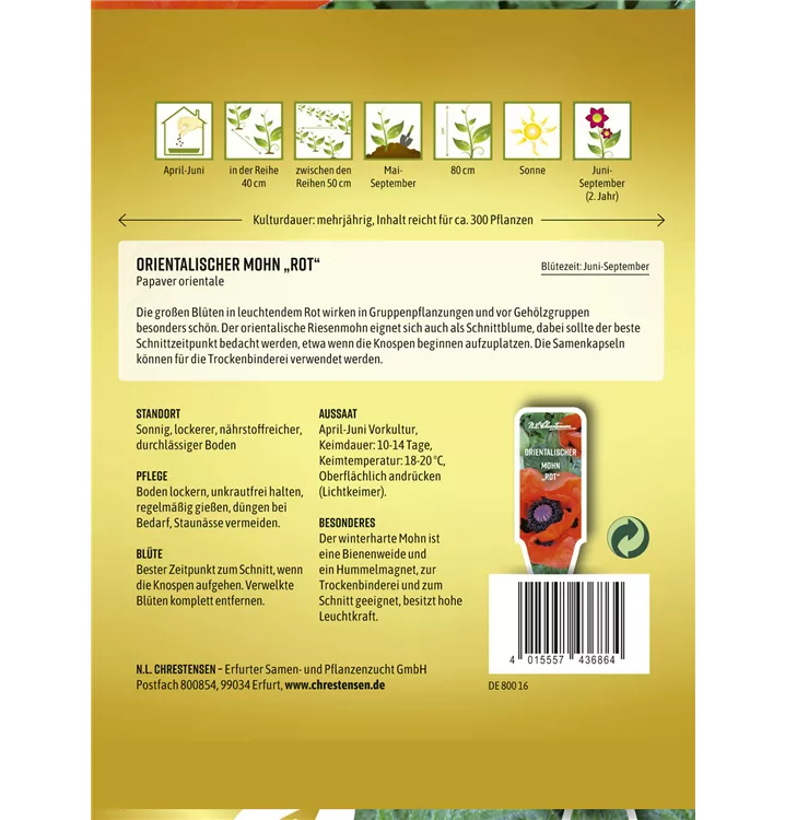 Der Orientalische Garten-Mohn (Papaver orientale) ist eine aufrechte Staude, die von Juli bis August rote, schalenförmige Blüten bildet. An einem sonnigen Standort mit durchlässigem Boden erreicht er gewöhnlich eine Höhe von ca. 80 cm und wird ca. 50 cm breit. Der Orientalische Garten-Mohn ist gut frostverträglich.