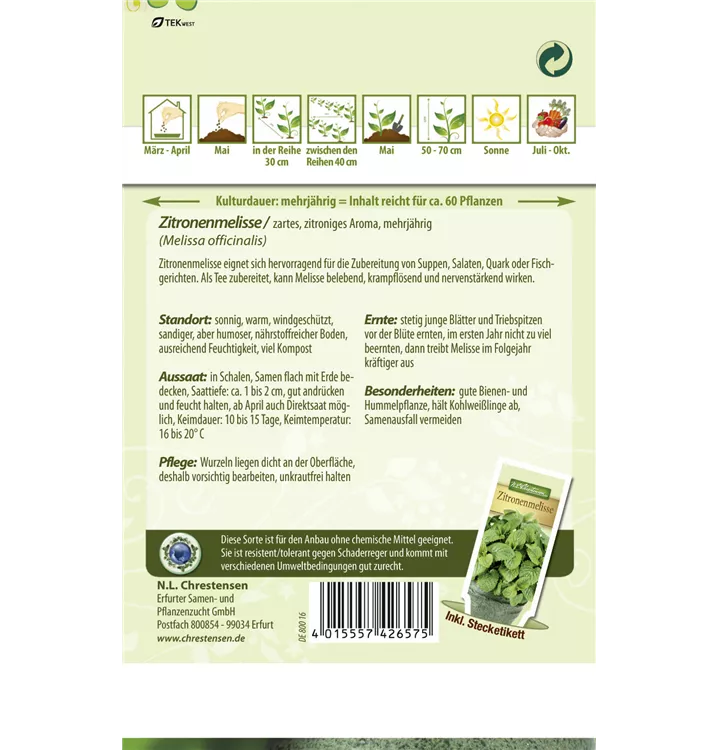 Zum Verzehr geeignet. Die hellgrünen, gesägten Blätter sind eiförmig und überzeugen mit aromatischem Geschmack.