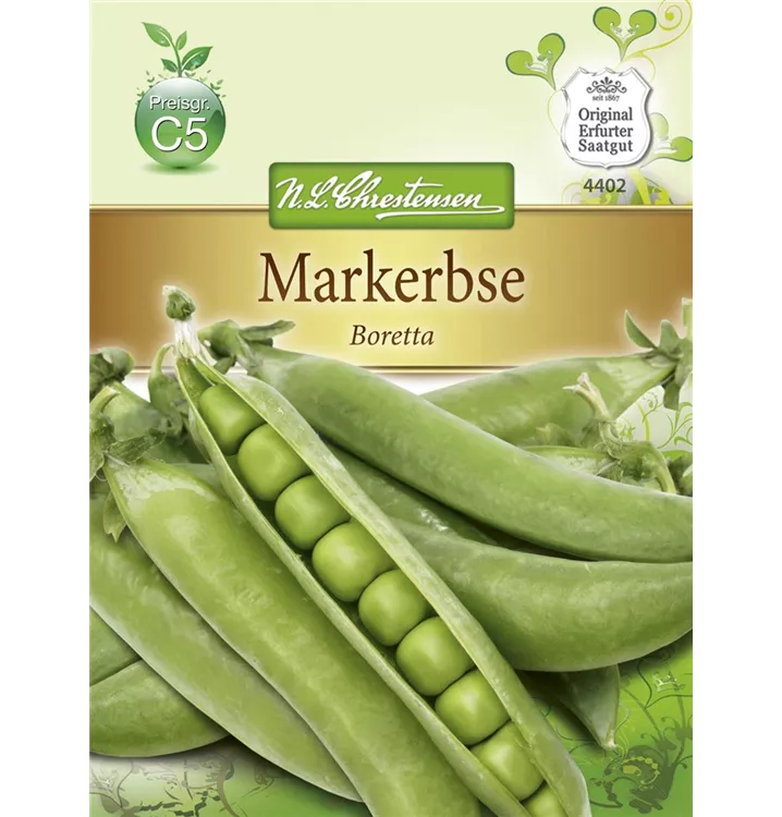 Die Markerbse 'Boretta' (Pisum sativum) bildet Samenkörner, die süß, aromatisch schmecken und bereits ab Juli geerntet werden können. Für das optimale Wachstum der Markerbse 'Boretta' werden ein sonniger Standort und durchlässiger, nährstoffreicher Boden benötigt.